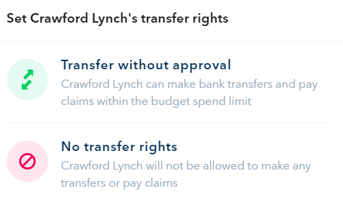 When you add a budget owner, you have the option to allow them to transfer without approval or no transfer rights.