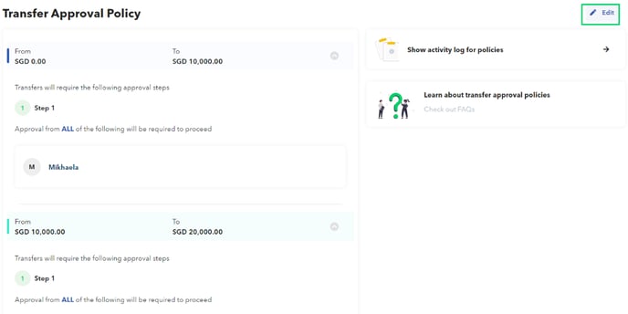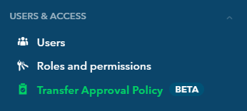 - Go to the "User & Access" Menu on the lower left of the page, then click "Transfer Approval Policy"