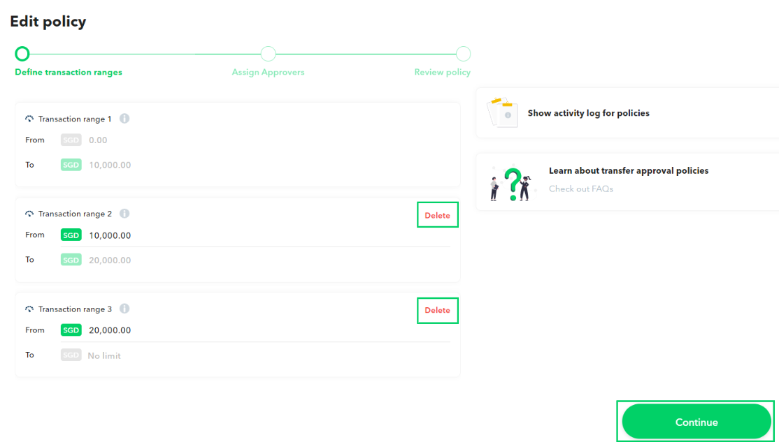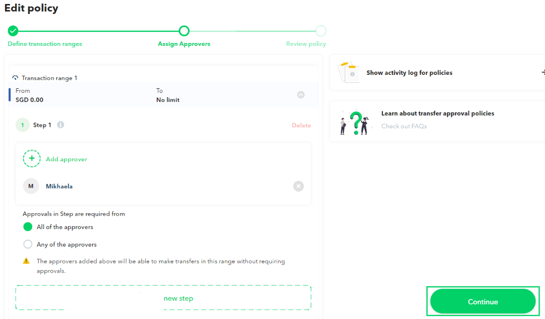 - Assign at least one approver (preferably an Admin user) to review transfers submitted by your Finance Submit users, then click "Continue"