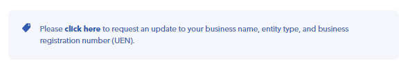 - To update your business name, entity type, and business registration number, kindly submit a request through the blue form provided in your account as shown below.