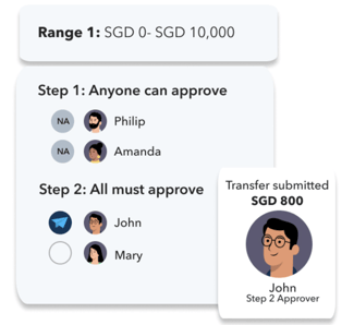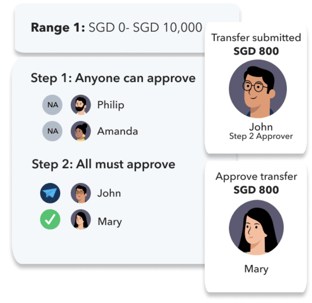 - Approvals from subsequent steps will be required. (If a Step 2 approver creates a transfer, Step 3 approvals will be needed).