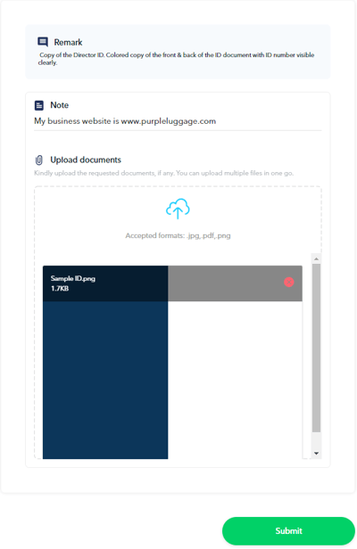 - Type in any additional information needed on the "Note" field or upload multiple documents under "Upload documents" box, then click "Submit"