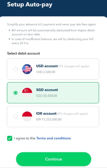 You can now pay your Aspire Advance Card automatically using your SGD, USD or IDR Aspire Account