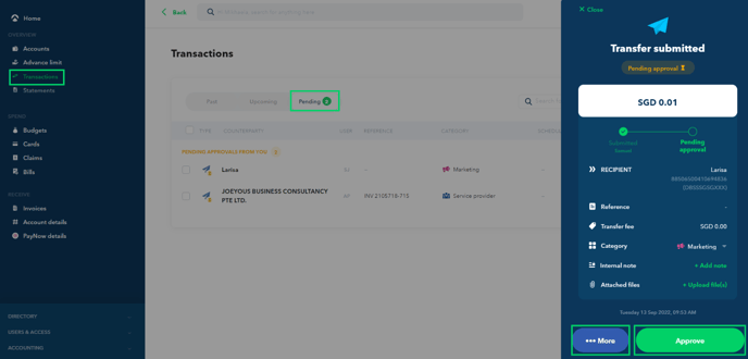 - Click the "More" button to reject or modify the transfer or click "Approve" if all is good. Transfers can be approved or rejected individually or in bulk.