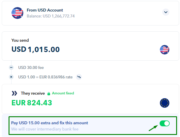 Use the toggle shown to fix the amount. This will secure that your recipient will receive the total amount and pay no fees.