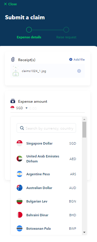When you submit a claim, you can select the expense amount and click on the currency of your choice.