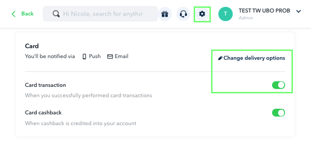Head to Settings > Notifications > Turn on notifications for all transfers and card payments