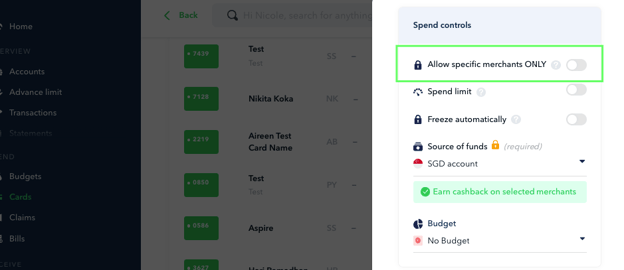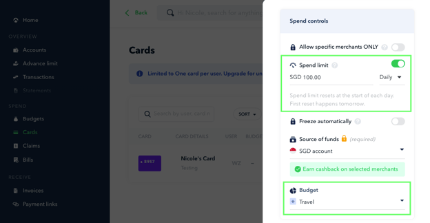 You can also enforce spend controls for each card or a group of cards. Simply head to Card > Edit > Switch on Spend limit or add card to Budget.